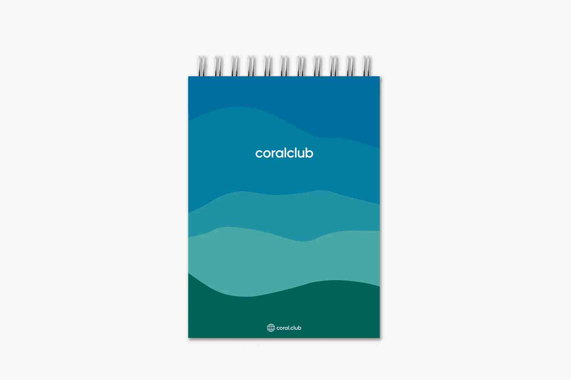 • Brightly colored notebook with Coral Club logo